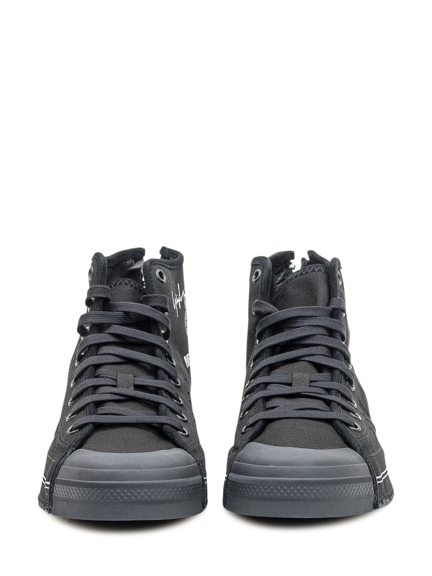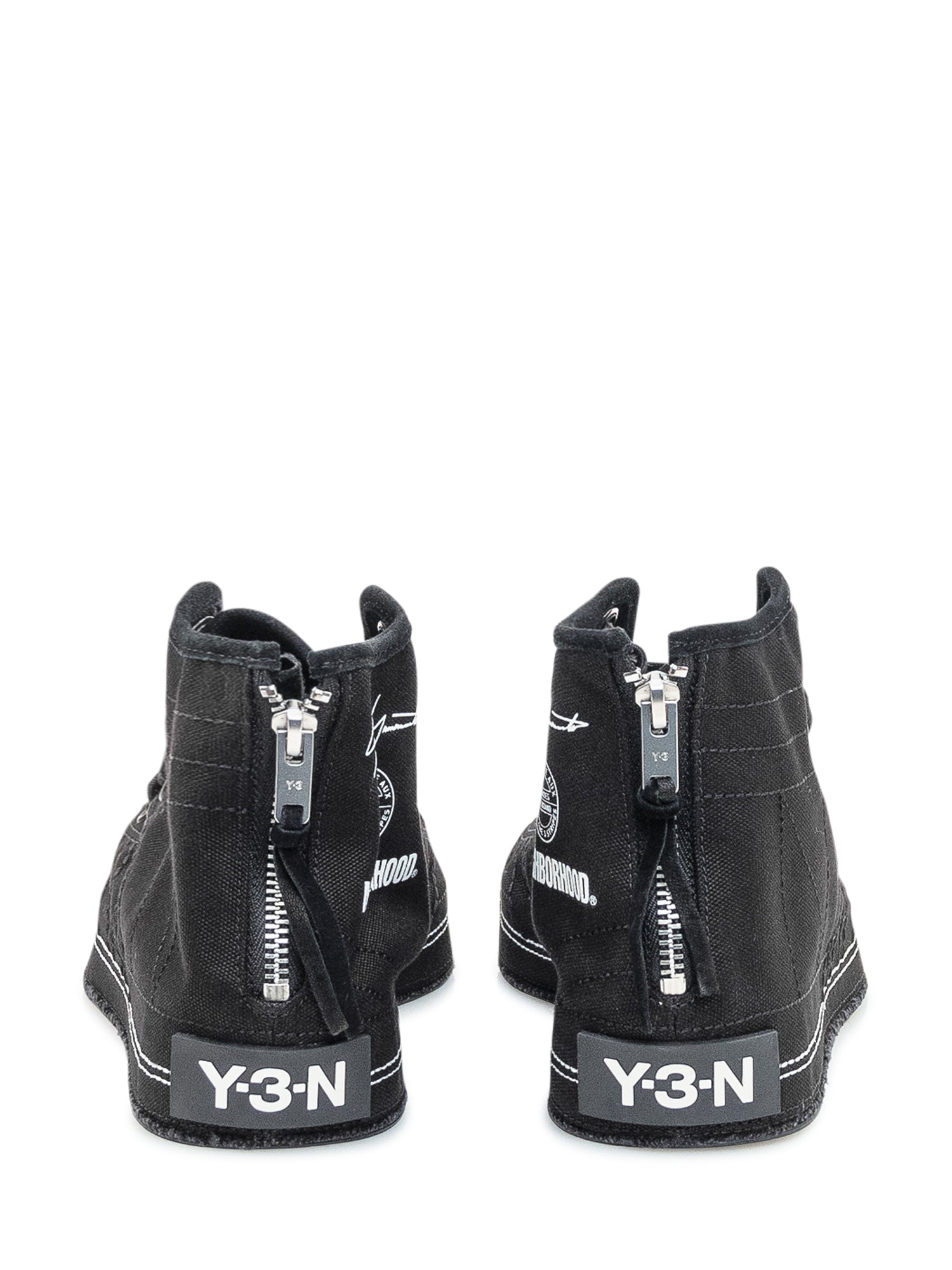 Sneakers Y-3 x Neighborhood Nizza in tela nera con dettagli a contrasto e zip posteriore.