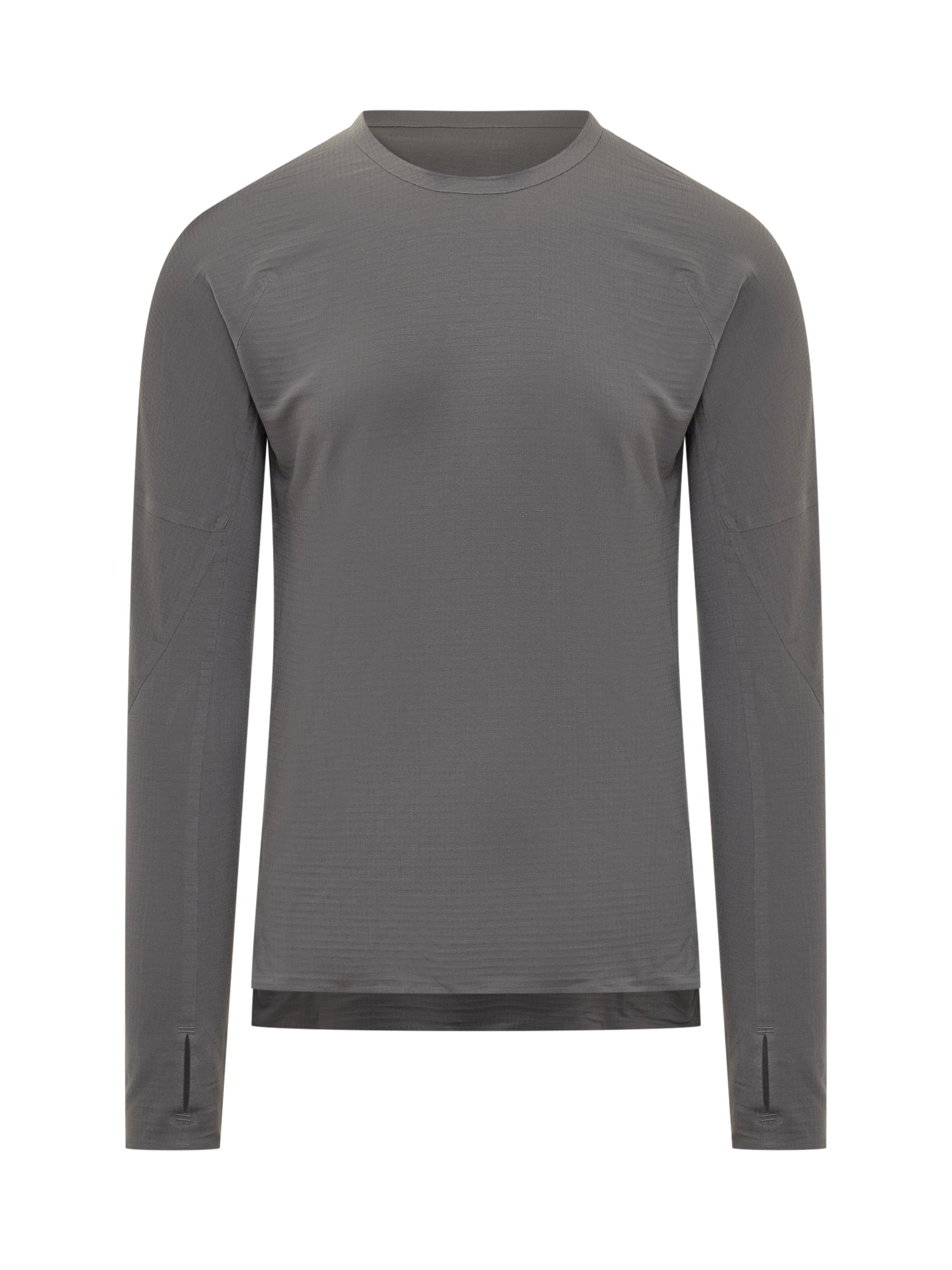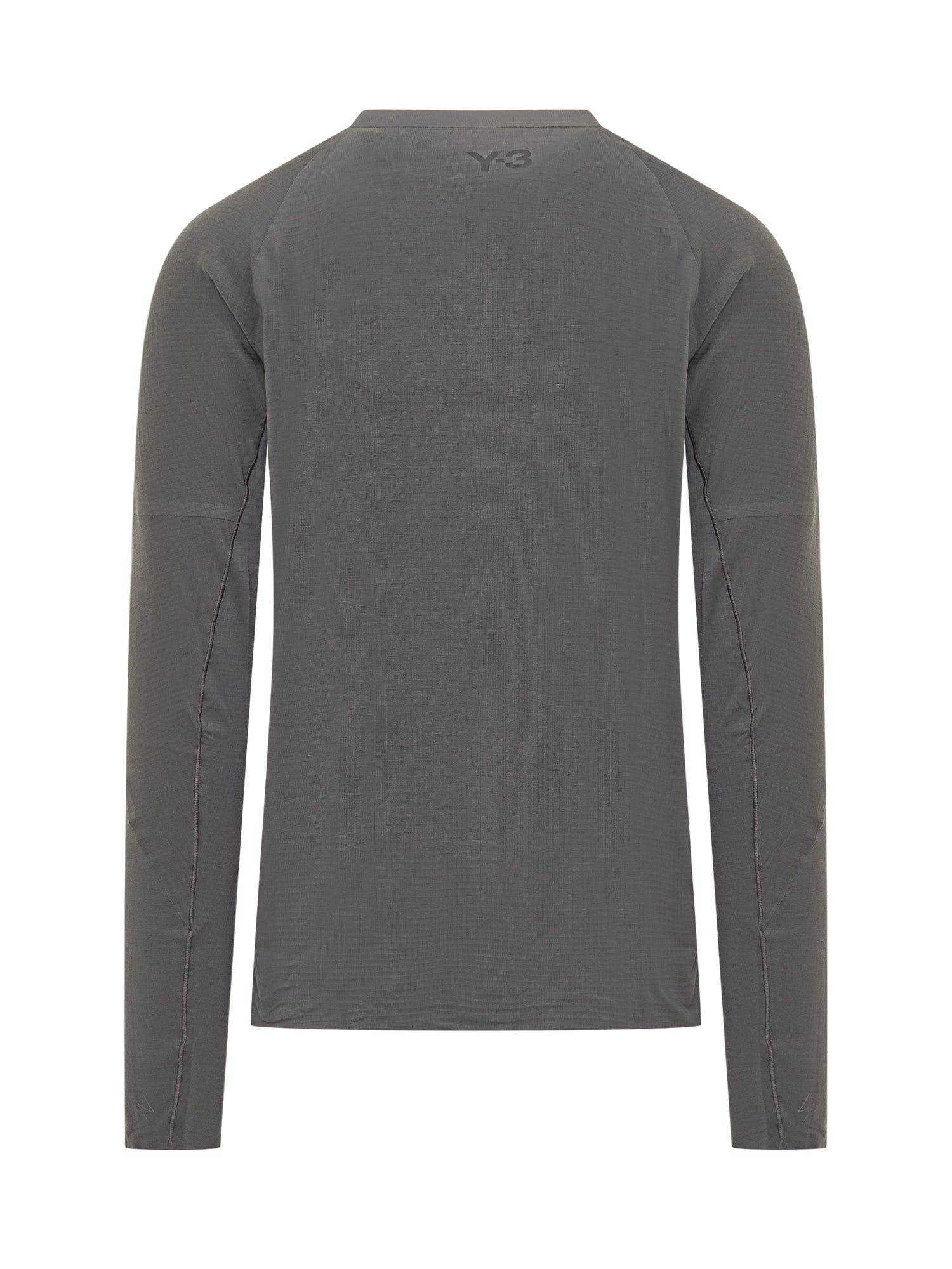 Maglia Y-3 grigia a maniche lunghe in tessuto tecnico traspirante, con dettagli ergonomici e design minimal.