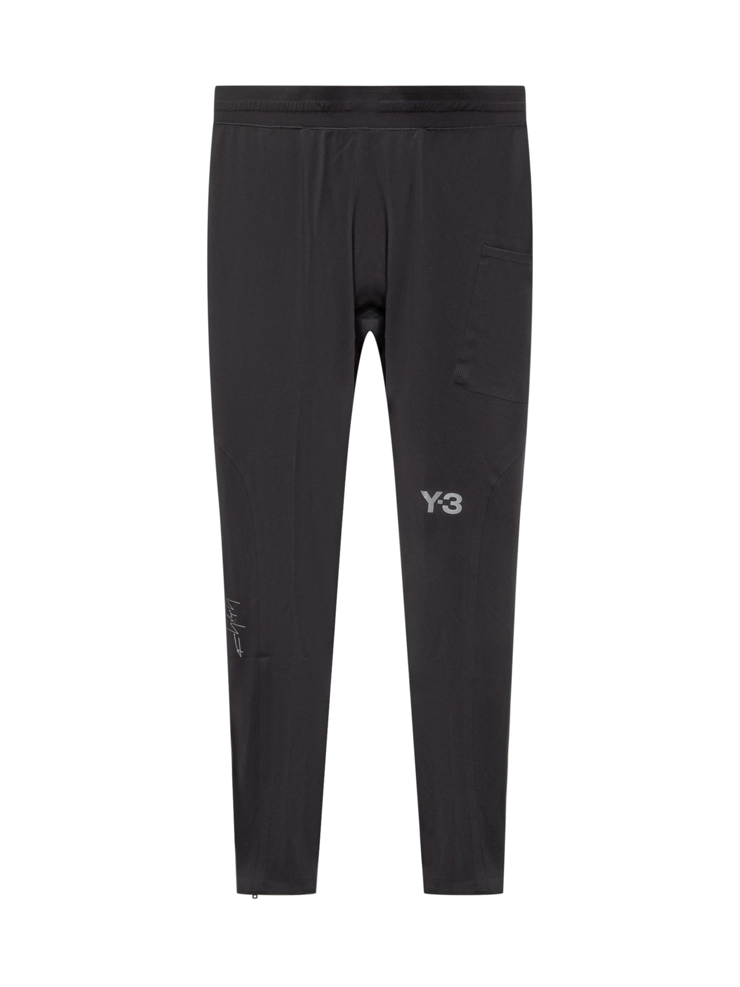 Pantaloni neri Y-3 in tessuto tecnico leggero con vestibilità slim, tasca laterale e logo stampato.
