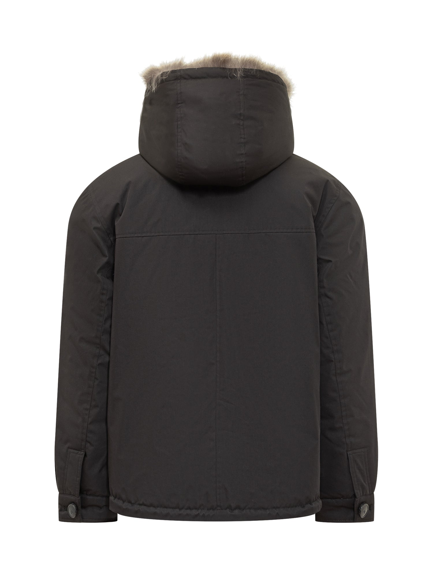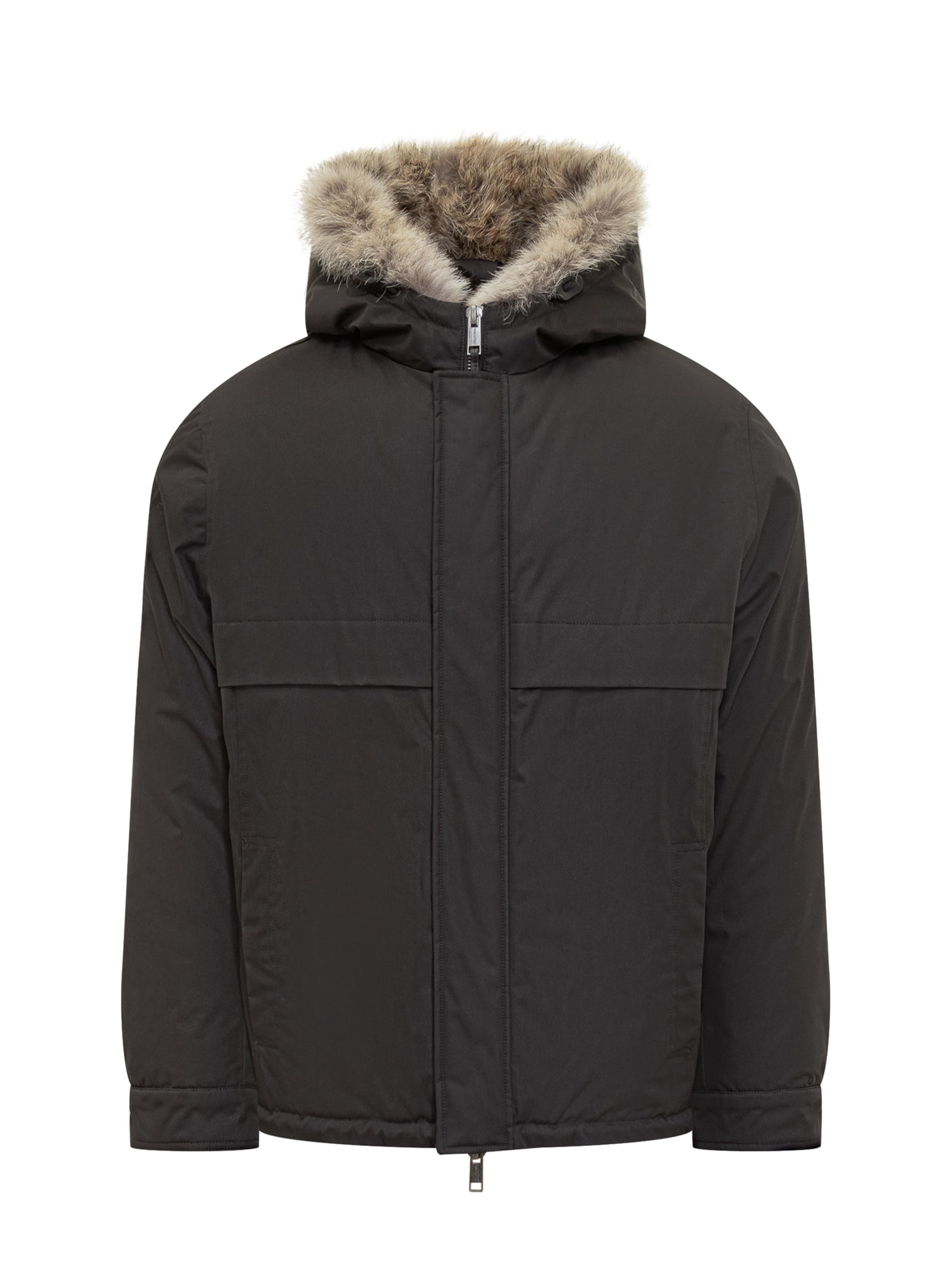 Parka Yves Salomon nero con cappuccio rifinito in pelliccia. Caldo e versatile.